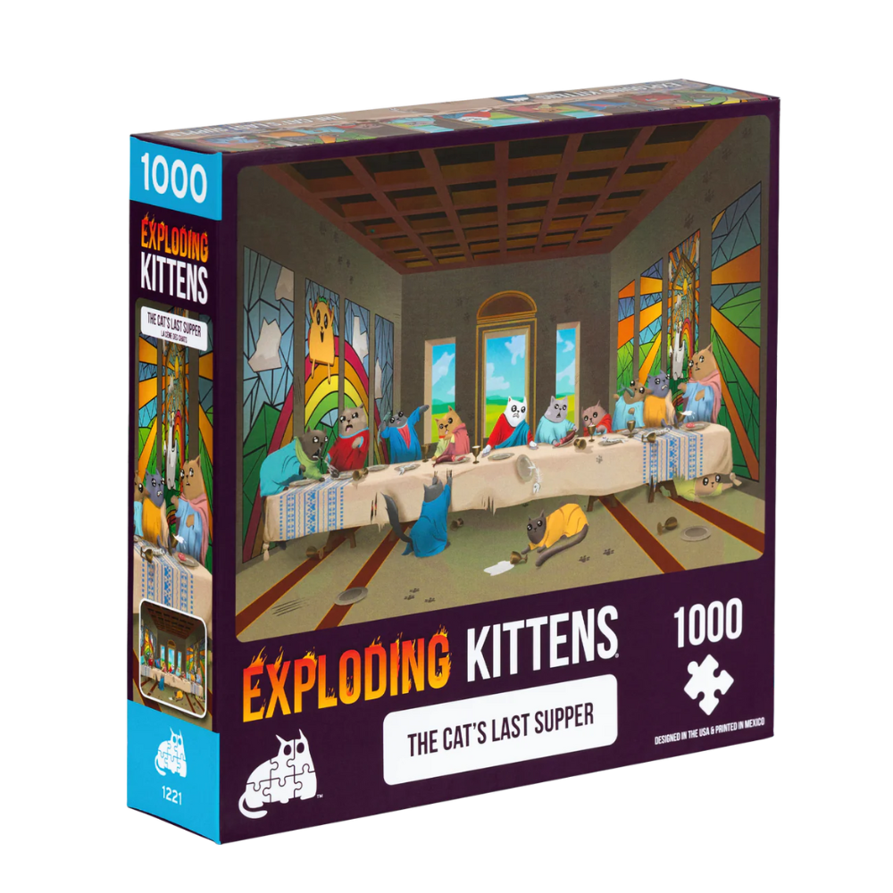 Any dinner party can be a bit like herding cats. Especially when your guests are actually cats. Once the sound of a can has been breached, fur flies. Who will get the last fishbone? Enjoy this puzzle, which pays homage to a classic painting—with an Exploding Kittens twist.