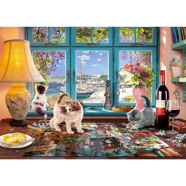 The owner of this desk has stepped away for a moment or two, and their cute kittens have moved in to give a helping hand (or paw) with the assembly of the jigsaw puzzle! This desk must be an idyllic place to spend some time. You’re surround by things you love and if you need to rest your eyes from puzzling, just look out of the window and survey the stunning seaside view and distant hills.