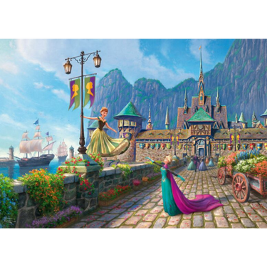 Join Anna and Elsa in a joyful celebration outside the royal castle in this 1000-piece puzzle from Schmidt’s Disney Dreams Collection, featuring the artistry of Thomas Kinkade Studios. With ships in the harbour, colourful banners fluttering, and Arendelle basking in sunshine, this puzzle captures the heartwarming spirit of sisterhood and new beginnings.