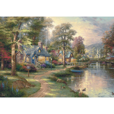 Step into the peaceful charm of a lakeside retreat with the Hometown Lake 1000-piece wooden jigsaw puzzle by Schmidt. Featuring the exquisite artistry of Thomas Kinkade, this stunning scene captures a cosy cottage nestled among lush trees, its warm glowing windows inviting you into a world of serenity. A gentle winding path leads to a tranquil lake, reflecting the soft light of dusk, while boats rest quietly on the calm waters, creating a sense of home and nostalgia.