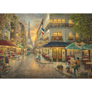 Transport yourself to the romantic streets of Paris with the Paris Café 1000-piece wooden jigsaw puzzle by Schmidt. Featuring the timeless artistry of Thomas Kinkade, this beautifully detailed scene captures a charming Parisian street café, glowing warmly under the soft hues of the evening sky. The Eiffel Tower rises majestically in the background, while bustling shops, cosy bistros, and cobblestone pathways create an enchanting atmosphere full of old-world charm.