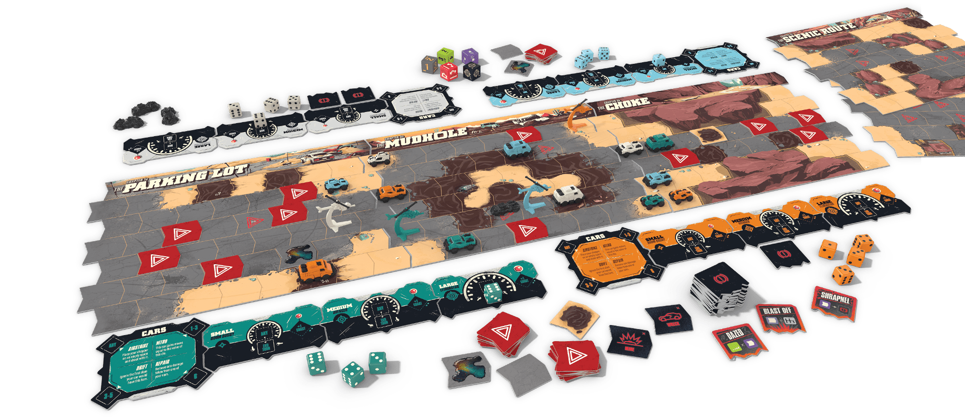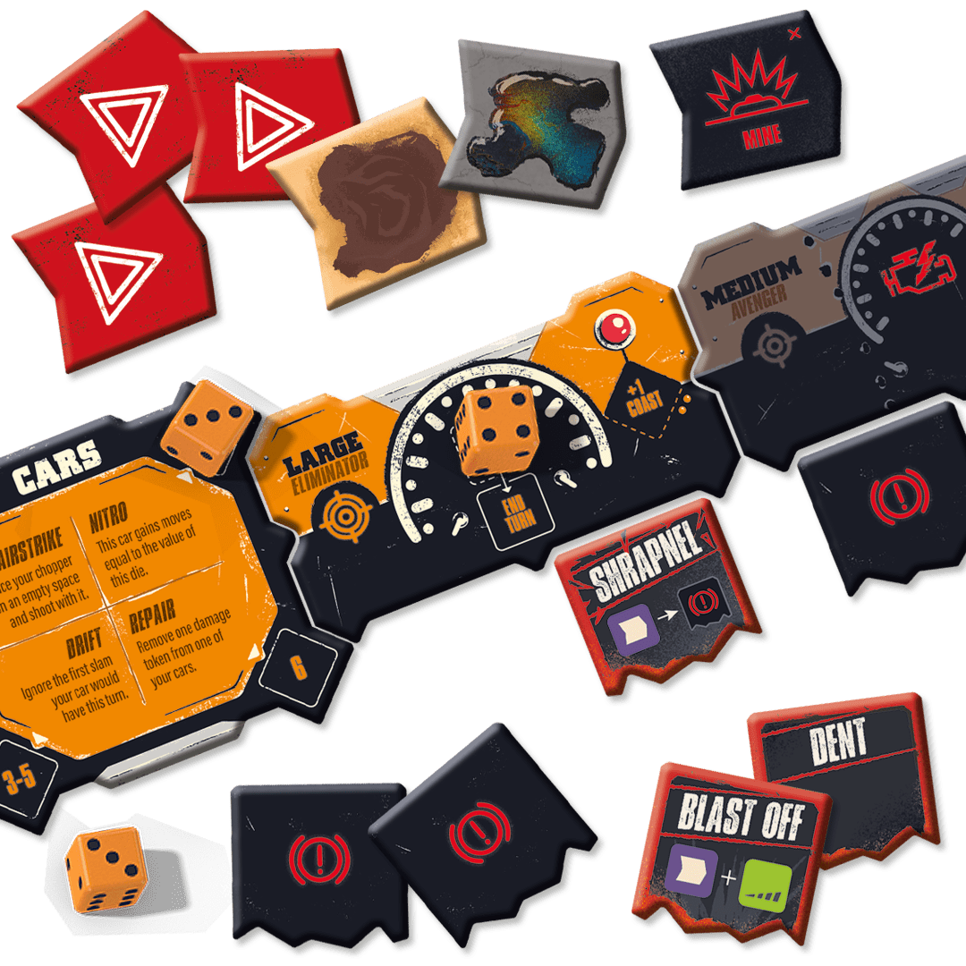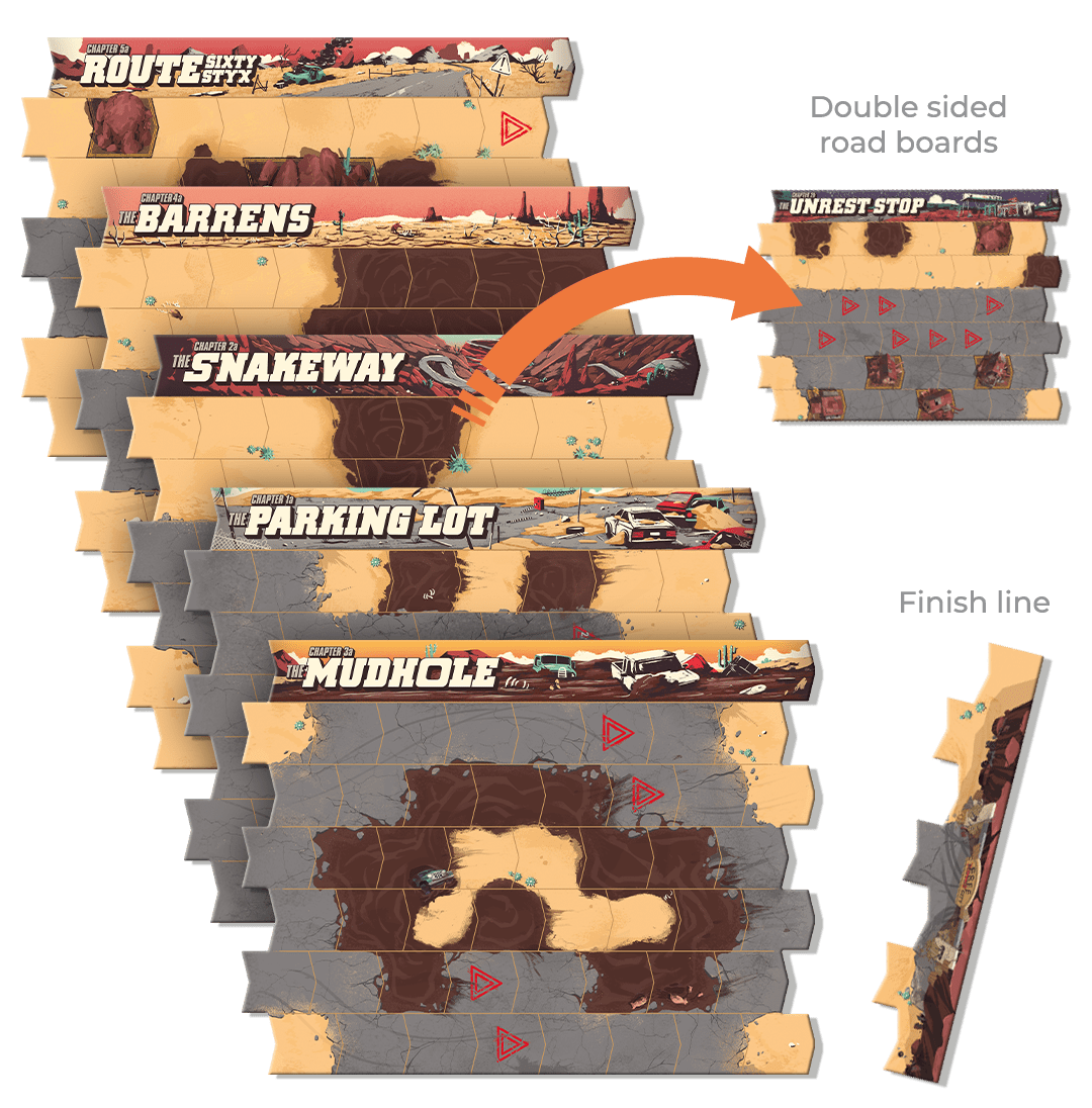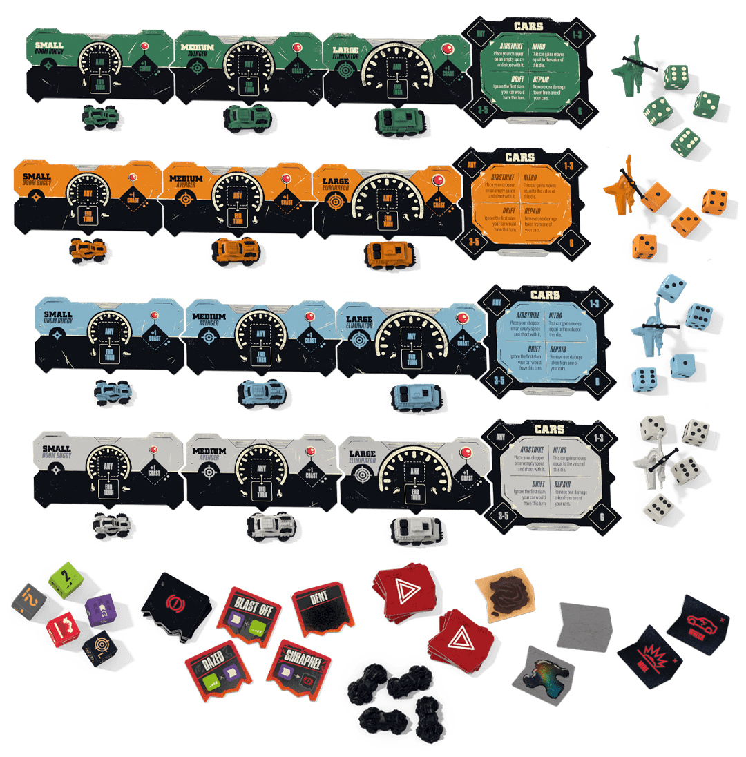 The legendary game of combat-racing through the wasteland is back. Take control of your crew and put the pedal to the metal, pushing your cars faster and faster. If you’ve got your opponent in your sights, fire your guns or try to slam them into the rocks. All the while,avoiding deadly obstacles and your opponents’ own tricky tactics. Detailed vehicle minis, chunky dice, and the game’s signature “infinite” road board make this a racing game like no other. And all the chaotic action is brought to life by the signature style of illustrator Marie Bergeron. Drive like your life depends on it! ‘Cause it does!