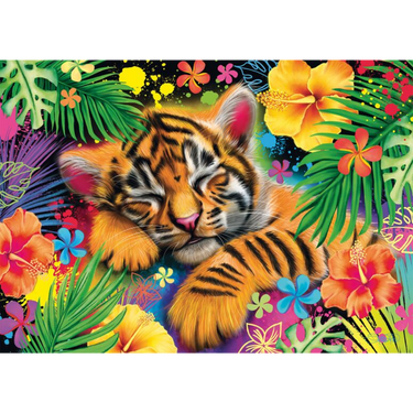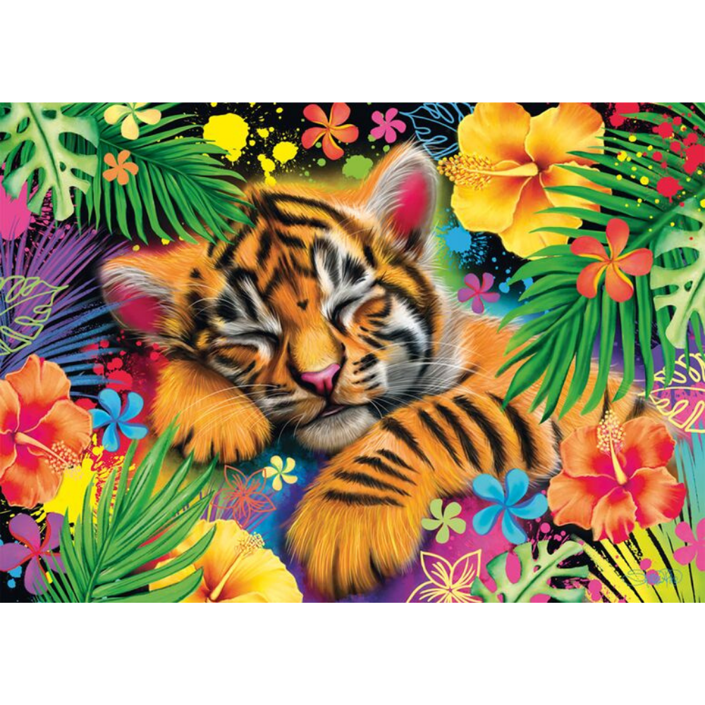 Tiger Cub is a striking 1000-piece jigsaw puzzle featuring a peaceful young tiger nestled among vibrant tropical leaves and flowers. The cub’s soft stripes and relaxed expression contrast beautifully with the bold splashes of colour surrounding it, creating a scene that feels both calming and full of life.