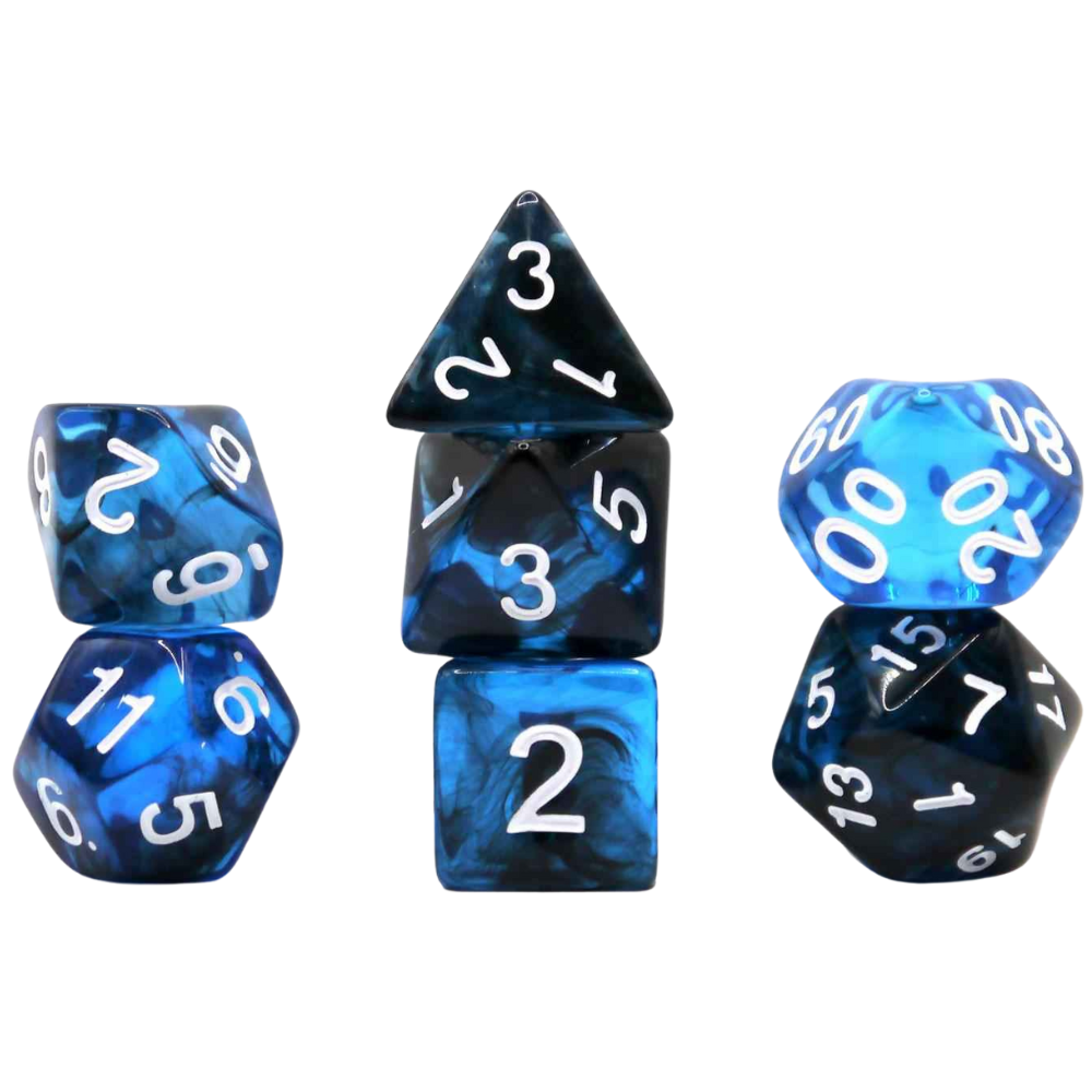 7-piece polyhedral RPG dice set consisting of the typical and relevant RPG dice: D4, D6, D8, D10 (0-9), D10 (00-90), D12 and D20.