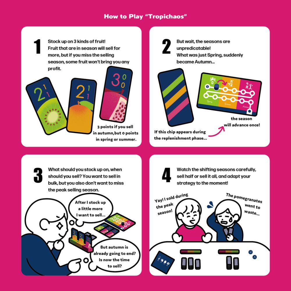 Spring that lasts too long. Summer that's too short. And winter has disappeared. Fruit sellers battle it out in these strange seasons. The price of fruit fluctuates depending on the season. Will you play it safe and frequently sell, or stock up and then sell it all? If you miss the season, the price will plummet in the blink of an eye. This is a thrilling board game where you're at the mercy of luck, constantly torn between risk and reward!