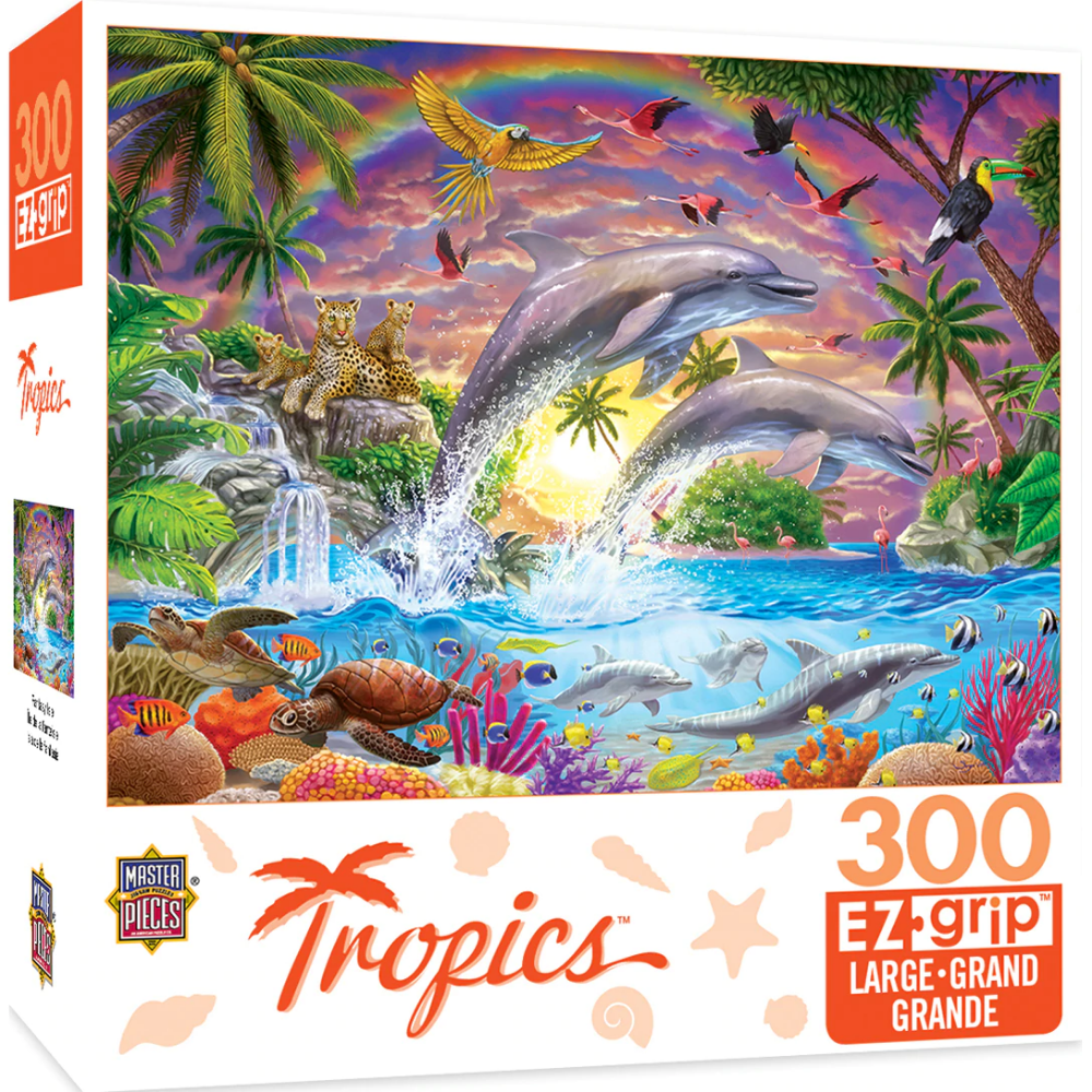 This tropical marine scene features jovial dolphins in flight of a jump surrounded by colourful vegetation and birds flying around also with an under water peak of all the life happening under the sea. Created by artist Carolyn Steele. Features extra large pieces.