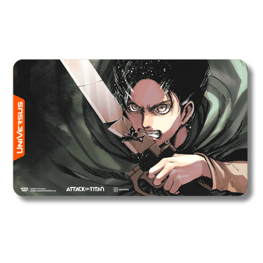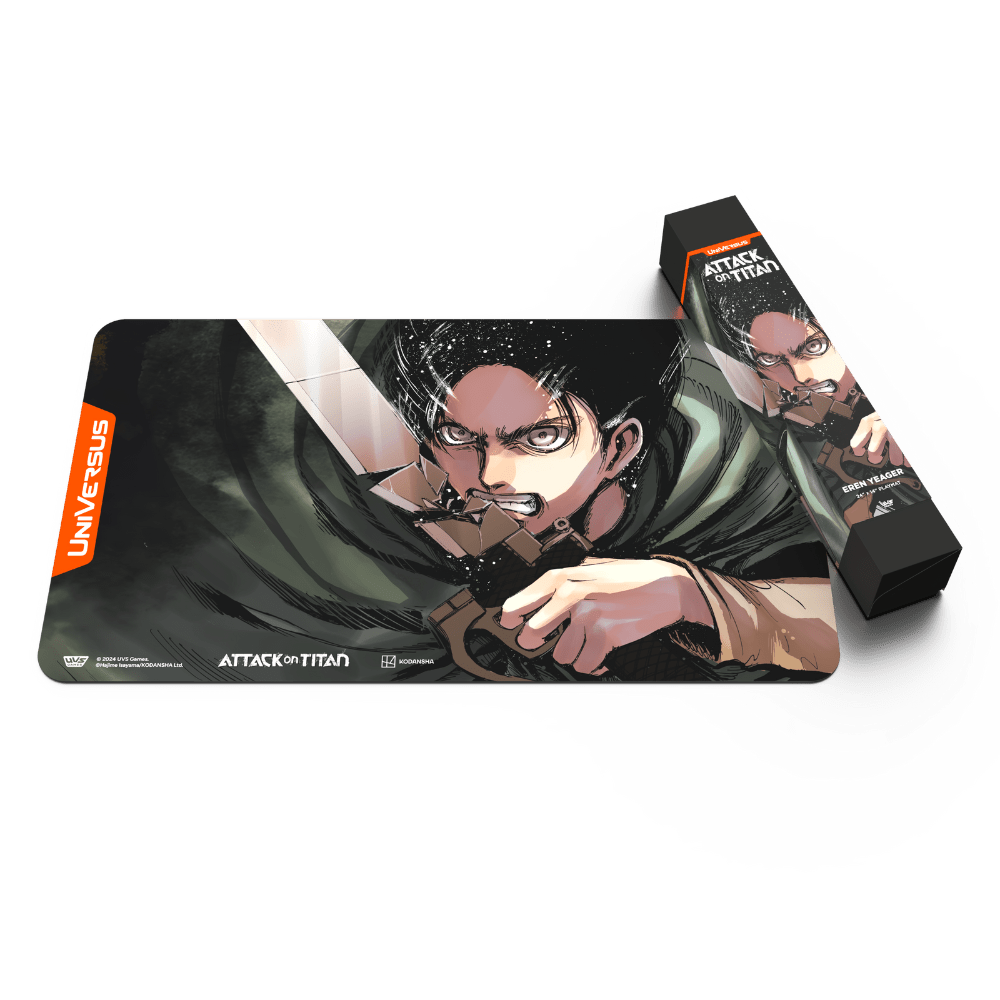The Eren Yeager playmat from UniVersus features unique artwork that embodies the determination and power of one of the series' most iconic characters. The playmat showcases a detailed illustration of Eren in action, capturing his fierce resolve. This high-quality design not only enhances your gaming experience but also serves as a collector's piece for dedicated fans of Attack on Titan.