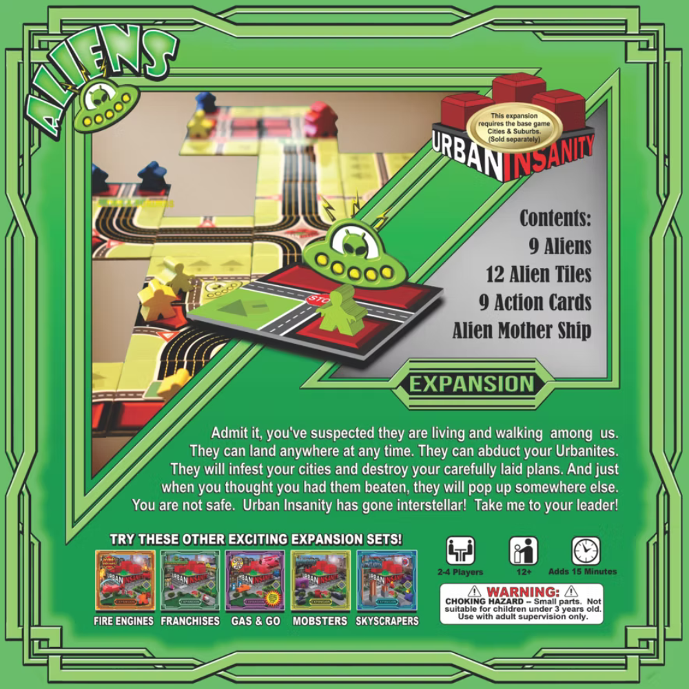 Admit it, you’ve suspected that they walk among us. Aliens can appear in any part of the city unannounced and uninvited! And they do not play by the rules! They can abduct your Urbanites and take them hostage.