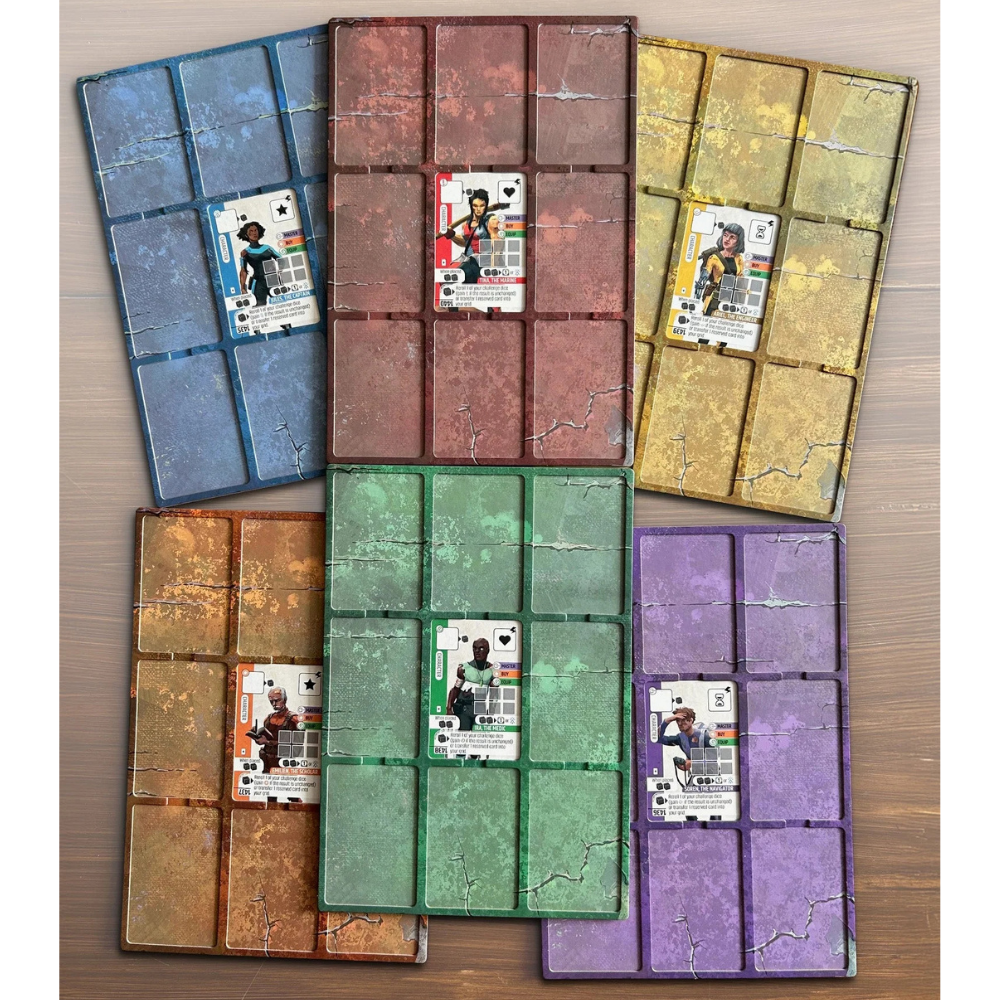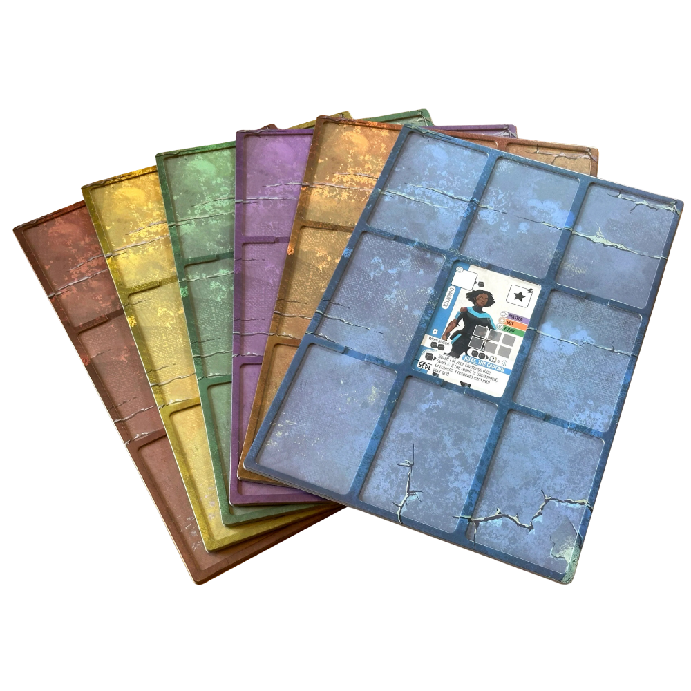 These 6 dual-layered cardboard playmats were designed specifically for Vantage. Each player will create a 3x3 grid of cards as they explore the world; these optional mats prevent cards from shifting. One pack covers the quantities needed for a full 6-player game.