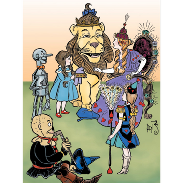 A yellow-brick road, a city made of emeralds, and a girl from Kansas wearing magical shoes: welcome to The Wonderful Wizard of Oz! The Scarecrow, the Tin Woodman, the Cowardly Lion, and Dorothy meet with Glinda the Good Witch in this illustration, reproduced for this fun 300-piece jigsaw puzzle.