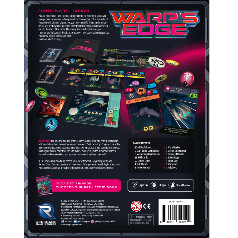 Warp’s Edge is a solo bag-building game of space combat. Pilot one of four starfighters, which each have their own unique weapon loadouts. You’ll be facing off against one of five alien motherships and its accompanying fleet. Every matchup offers a different challenge, pushing you toward new strategies and tactics. You have a limited number of warps to succeed, so choose wisely as you improve your arsenal and learn new skills!