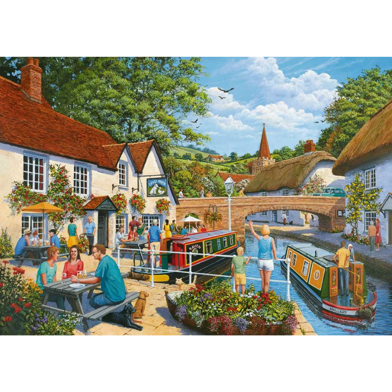 This picturesque scene captures many of the delights of a British summer. Canal boats potter along the waterway, people stroll around the pretty village and visitors to the Dog and Duck enjoy a quiet drink in the sunshine. Everyone appears relaxed and happy, relishing the warm weather and beautiful countryside. Perhaps after lunch, the pub’s customers will take a walk past the church and up into the rolling hills beyond?