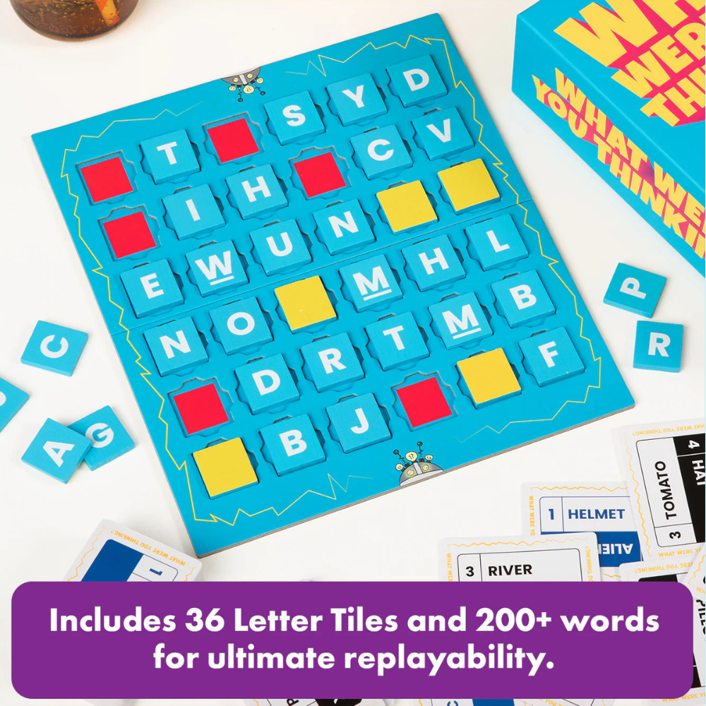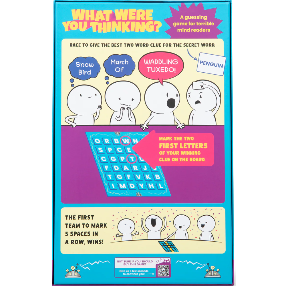 What Were You Thinking? is a word-guessing game for terrible mind readers, making it the ultimate party game for players to test how well they know their friends. During the game, players take turns giving one- or two-word clues to help their team guess a secret word, but the clue must start with a letter that can be found on the game’s letter grid.
