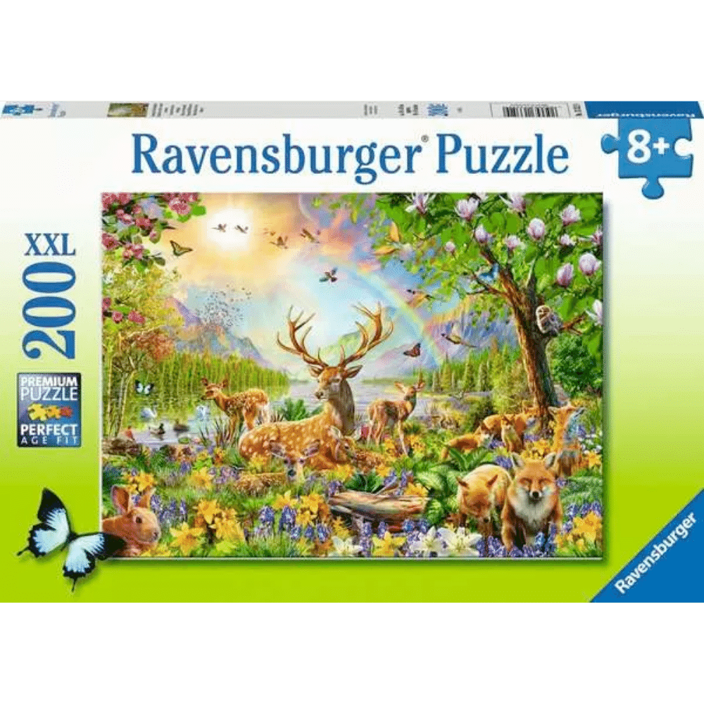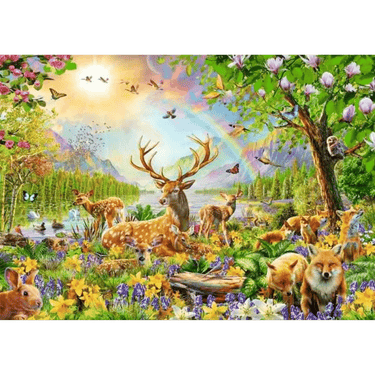 This beautiful wildlife scene shows wildlife in all it's glory. Different species of wildlife all together each preparing for their next adventure. With the beautiful bluebells nestled in amongst the grass and the powerful pine trees in the background it's enough to make you want to climb into the puzzle with the amazing views and fragrances!
