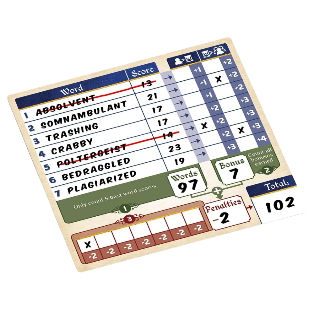 After 7 rounds, players add the scores their best 5 words, plus their bonuses. The player with the most points wins!